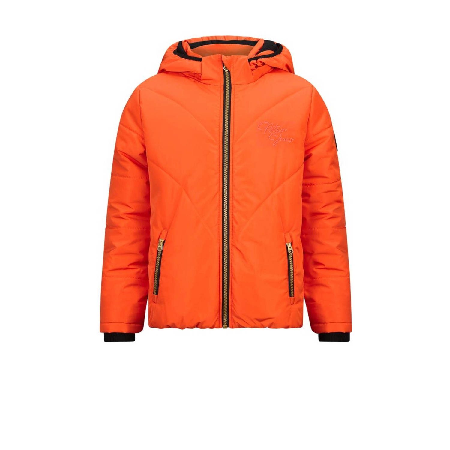 Hou je kleintje warm met deze schattige gewatteerde jas van Retour Jeans. Waterafstotend en voorzien van handige zakken, perfect voor avonturen buiten!