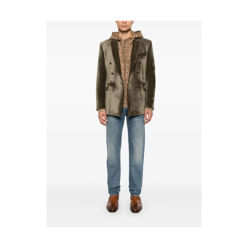 Upgrade je stijl met deze Reveres 1949 olijfgroene fluwelen blazer met peak revers, dubbele knoopsluiting, gepaspelde borstzak, twee zijflapzakken, lange mouwen met knoopmanchetten, Engelse achtersplit en een rechte zoom. Perfect voor de moderne man.