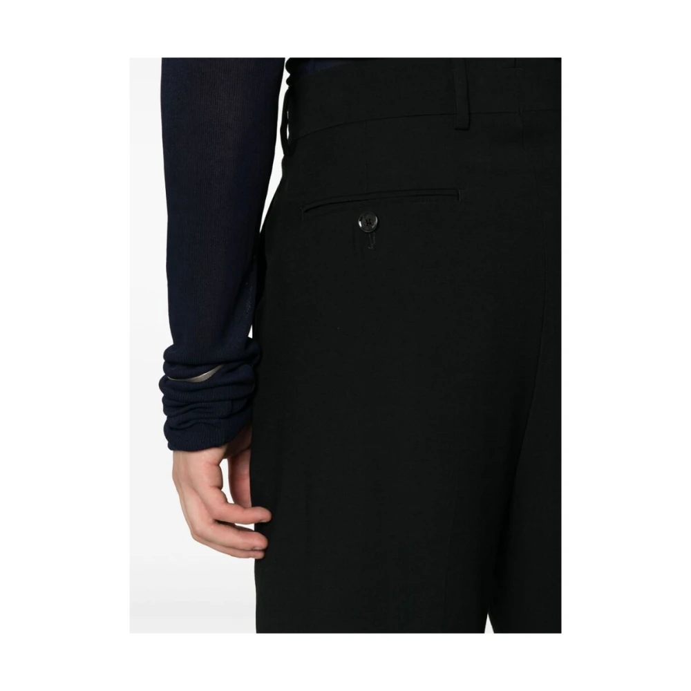 Upgrade je garderobe met deze Reveres 1949 wijde broek voor heren. Gemaakt van een strakke zwarte keperbinding, hebben deze broek riemlussen, persvouw, twee zijdelingse steekzakken, omgeslagen zoom, twee achterzakken met knoopsluiting en een verborgen voorste knoop, haak en ritssluiting.