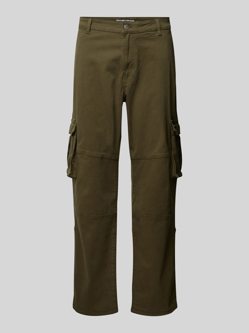 Cargobroek voor heren van REVIEW. Katoenmix met stretchgehalte. Recht model. Effen design. Knoop- en ritssluiting. Opgestikte klepzakken. Gestikt logo. Siernaden. Zoom met tunnelkoord. Achterzakken. Bandwijdte bij maat M: 46 cm. Binnenbeenlengte bij maat M: 78 cm
