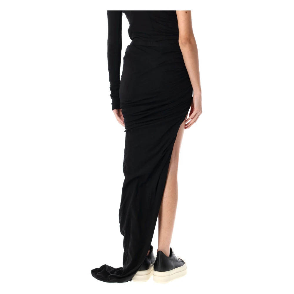 Upgrade je stijl met deze katoenen rok tot op de vloer van Rick Owens Drkshdw. Met een unieke driehoekige omslagvorm, elastische tailleband, hoge split en verzamelde drapering voor een elegante silhouet. Model is 1, 70 m en draagt maat S.