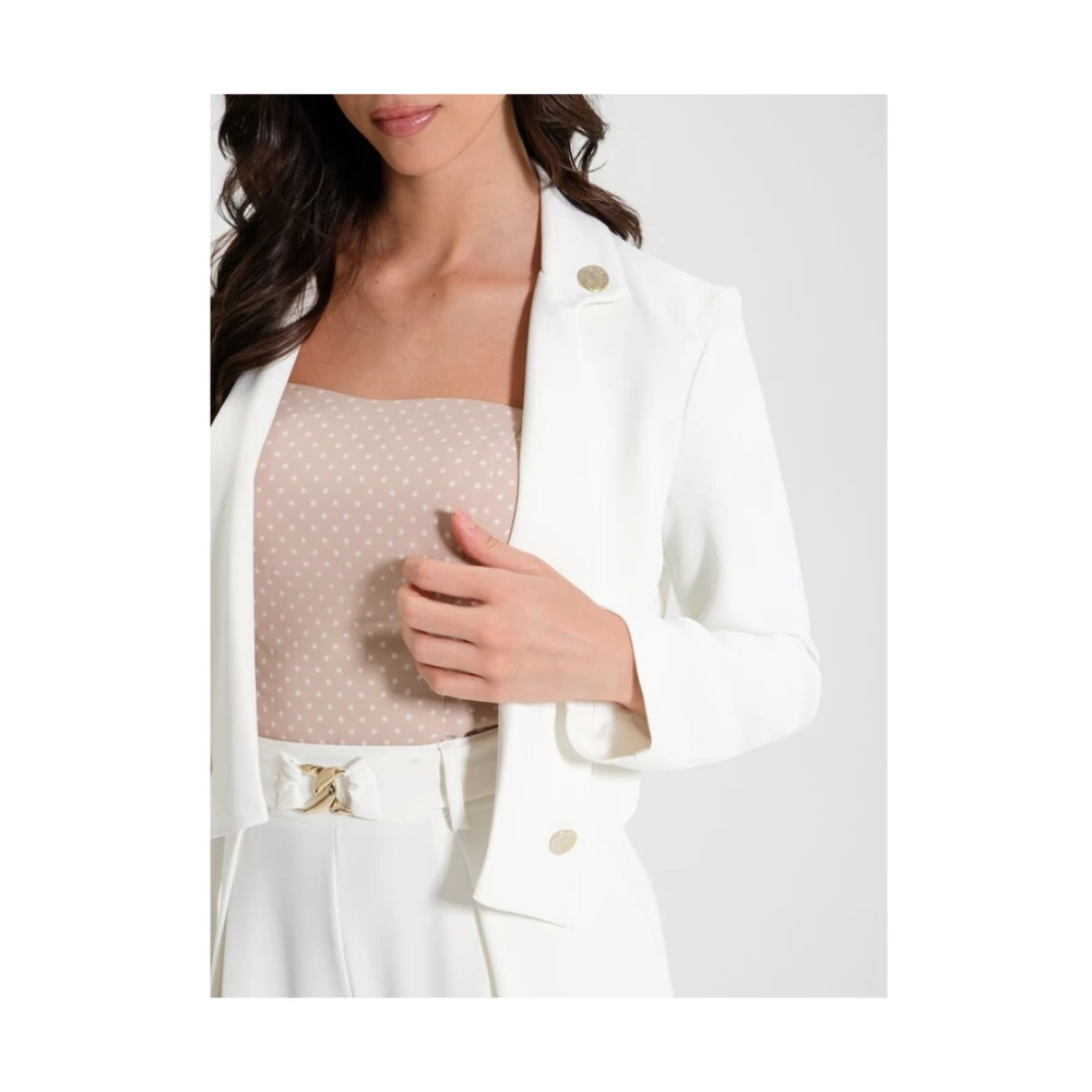 Rinascimento presenteert het Korte Open Jasje met Knopen, een veelzijdig kledingstuk gemaakt van zachte cady stof. De royale revers en decoratieve RR logo knopen voegen elegantie toe, waardoor het perfect is voor zowel casual als formele gelegenheden. Belangrijkste kenmerken: Wit | Zachte Cady Stof | Royale Revers | Decoratieve RR Logo Knopen | Afmetingen en pasvorm: Losvallend | Samenstelling en onderhoud: 96% Polyester | 4% Elastane