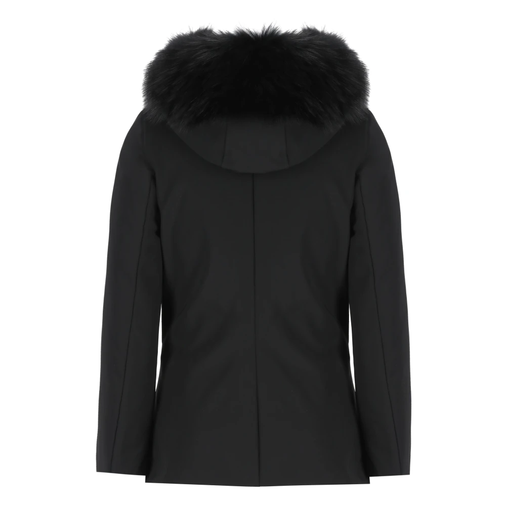 Blijf warm en stijlvol deze winter met de zwarte RRD Roberto Ricci Design gewatteerde jas voor vrouwen. Voorzien van een capuchon met bont, lange mouwen met logo-patch, ritssluiting aan de voorkant en twee voorzakken met rits.