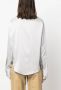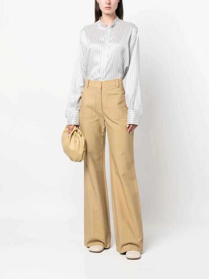 Gebroken wit, marineblauw, zijde, verticale strepen, bandkraag, knoopsluiting aan de voorkant, lange mouwen, knoopmanchetten en afgeronde zoom.