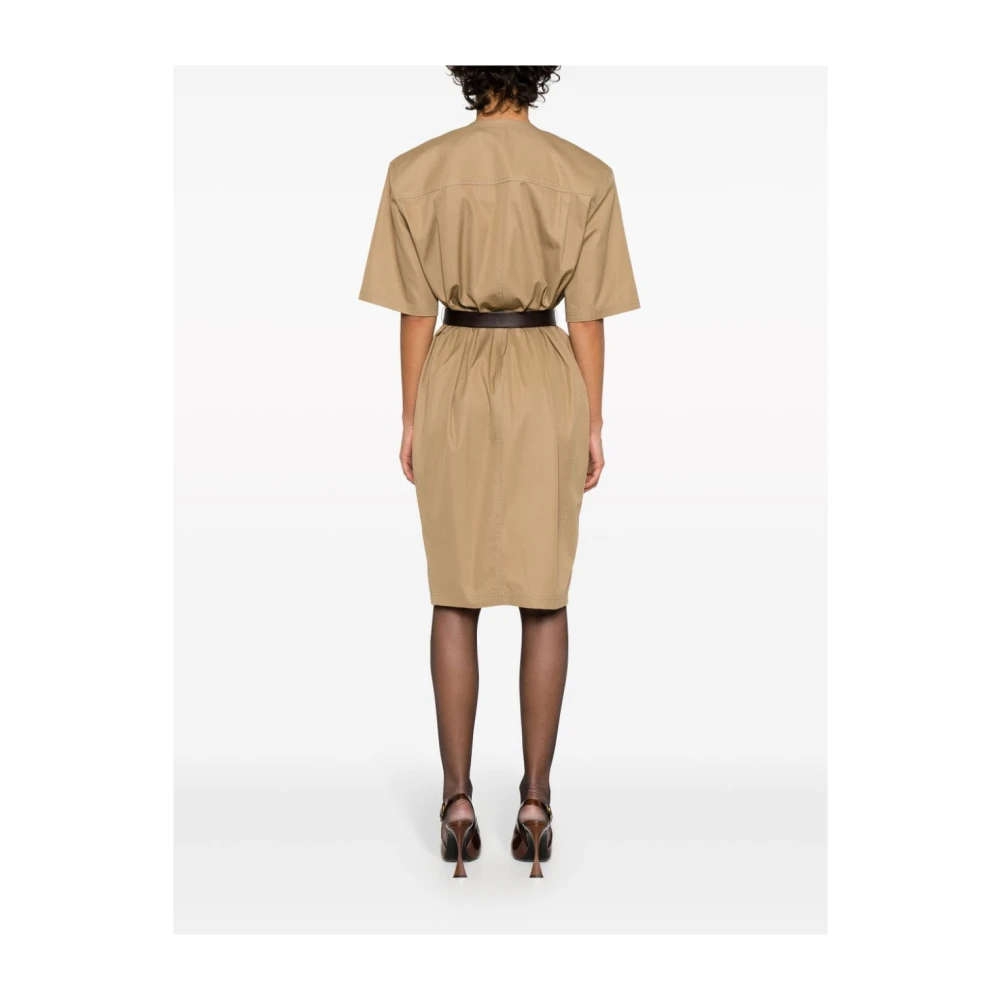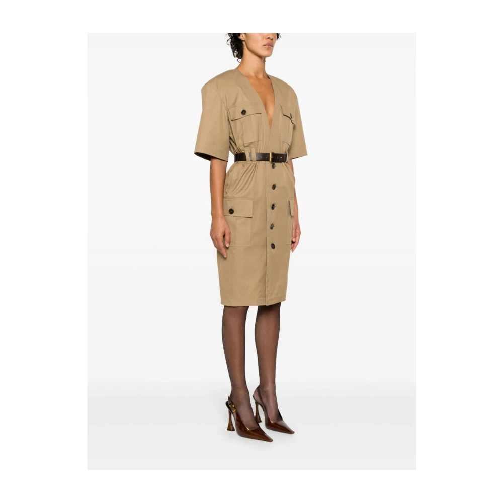 Upgrade je dagelijkse look met de chique saharienne jurk van Saint Laurent. Gemaakt van beige katoenen keperstof met een bruine leren riem, deze midi-jurk heeft een V-hals, knoopsluiting aan de voorkant, meerdere zakken, gewatteerde schouders, korte mouwen en een rechte zoom. Ongevoerd voor een licht gevoel. Maat FR; valt normaal qua maat.