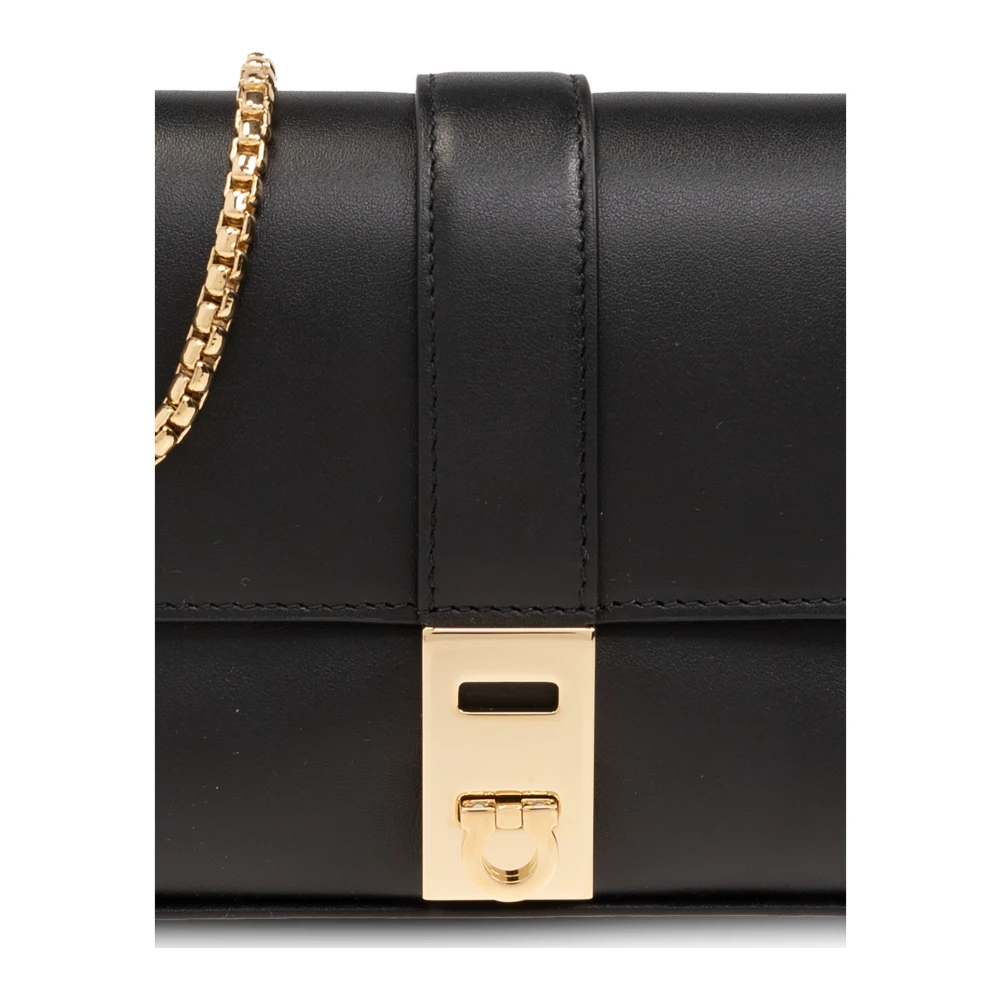 Zwarte Arch Mini schoudertas van Ferragamo. Gemaakt van leer, dit ontwerp sluit met een Gancini-sluiting en heeft een ketting schouderriem, goudkleurige metalen hardware en n interne compartiment met n insteekvak en zes kaartsleuven. Hoogte: 13 cm Breedte: 23 cm Afmetingen van het model Hoogte: 176 cm Borst: 85 cm Taille: 60 cm Heupen: 89 cm