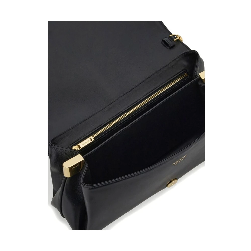 Upgrade je stijl met deze luxueuze Salvatore Ferragamo crossbody tas in zwart kalfsleer/lamsleer. Met gladde korrel en hardware in goudtinten, voorzien van een Gancini gesp, een enkele schouderband, een kettinglink handvat en een verdeeld compartiment met interne ritszak. De overslagtop met magnetische sluiting voegt een vleugje elegantie toe. Afmetingen: Diepte - 10, 922 cm, Hoogte - 15, 748 cm, Riem - 129, 54 cm, Breedte - 30, 988 cm.