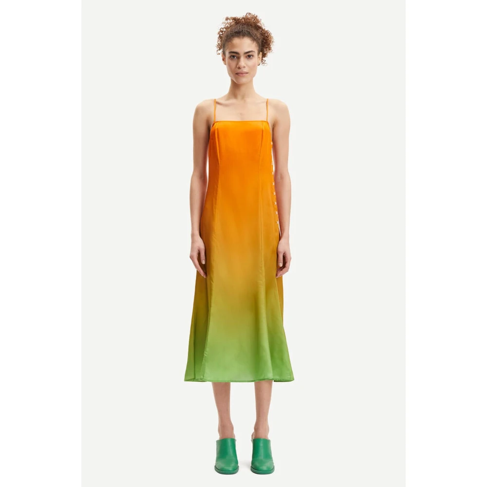 De Annah Gradient Jurk van Samse Samse is een veelzijdige midi-jurk van zijdemix met unieke kleurverlopen. Perfect voor zowel casual als elegante gelegenheden, en gemakkelijk te combineren met diverse accessoires. Belangrijkste kenmerken: Groen | Oranje | Multicolor | 74% Viscose | 26% Zijde | Spaghettibandjes | Strik op de rug | Knoopversieringen | Afmetingen en pasvorm: Normale pasvorm | Samenstelling en onderhoud: 74% Viscose | 26% Zijde | Uitsluitend chemisch reinigen