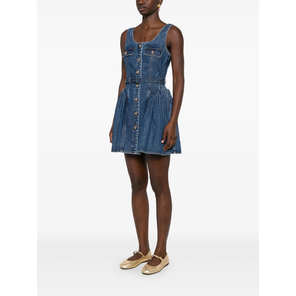 Geef je stijl een boost met de uitlopende mini-jurk van denim van Self Portrait, met een aansluitend lijfje en een wijde minirok versierd met gouden knopen. Perfect voor dagjes uit, deze jurk biedt een chique en veelzijdige look. Belangrijkste kenmerken: Blauw | 100% Katoen | Afneembare riem | Brede banden | Sluiting met knopen aan de voorkant | Peplums op de heupen | Afmetingen en pasvorm: Aansluitend lijfje | Samenstelling en onderhoud: 100% Katoen | Machinewas koud, droogtrommel laag