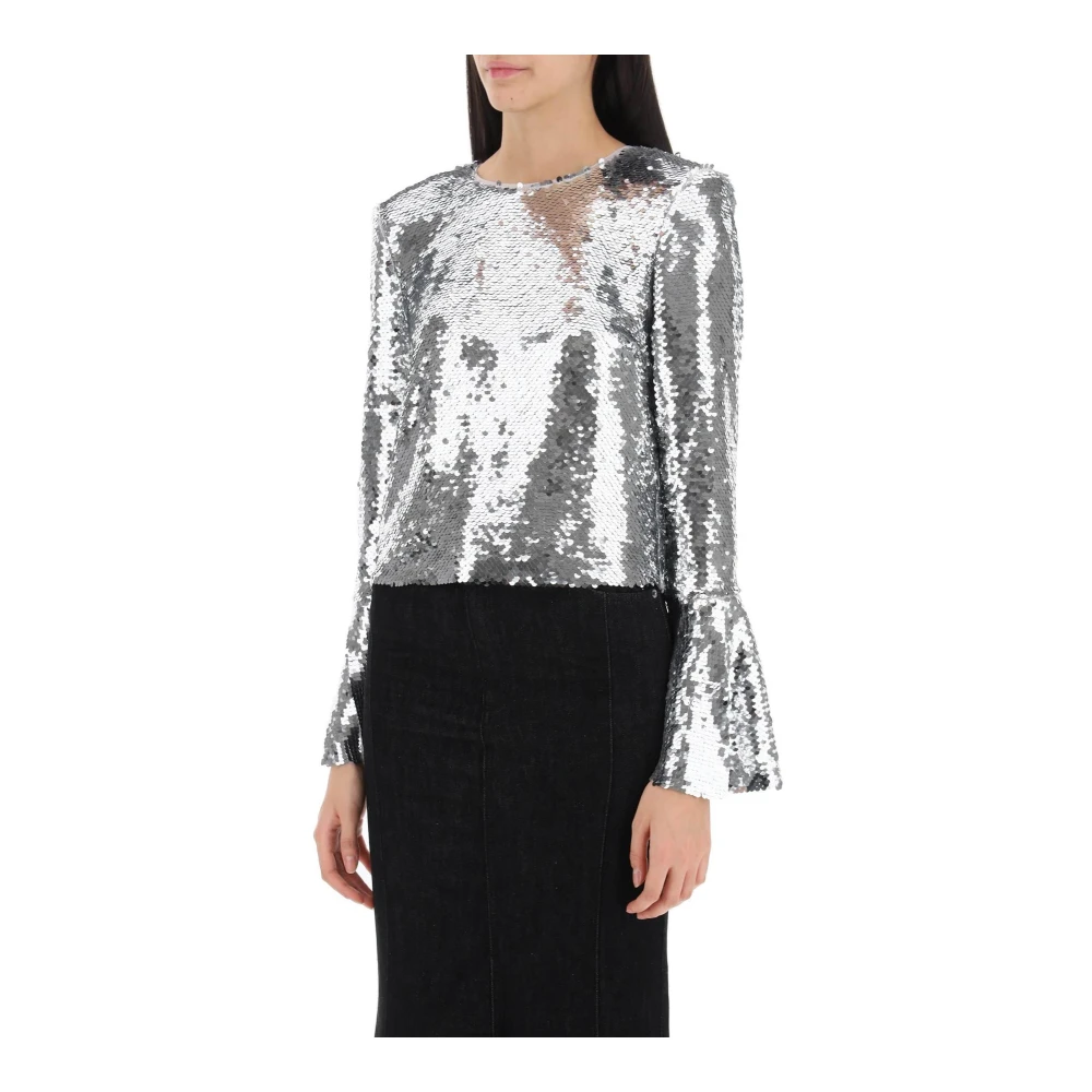 Zilverkleurige top van Self Portrait. Opgefleurd met pailletten, dit model sluit met een verborgen rits aan de achterkant met een haak- en oogsluiting en heeft afneembare schouderpadding en uitlopende lange mouwen. Modelmaten Hoogte: 176 cm Buste: 85 cm Taille: 60 cm Heupen: 89 cm Model draagt maat: 8