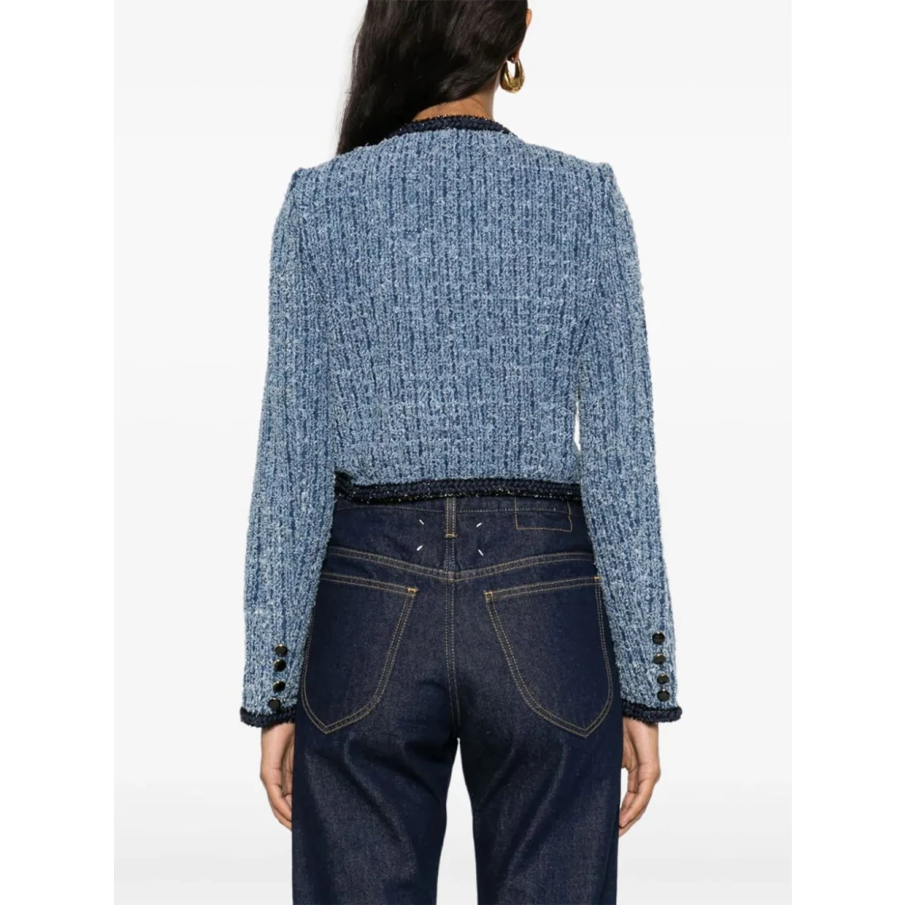 Upgrade je stijl met deze navyblauwe Self Portrait tweed jas. Gemaakt van een katoenmix, deze kraagloze jas heeft een gevlochten lurex rand, schoudervullingen en decoratieve knoopdetails. De cropped silhouet en vier voorzakken met knoopsluiting voegen een vleugje elegantie toe. Gemaakt in China. Machinewasbaar.