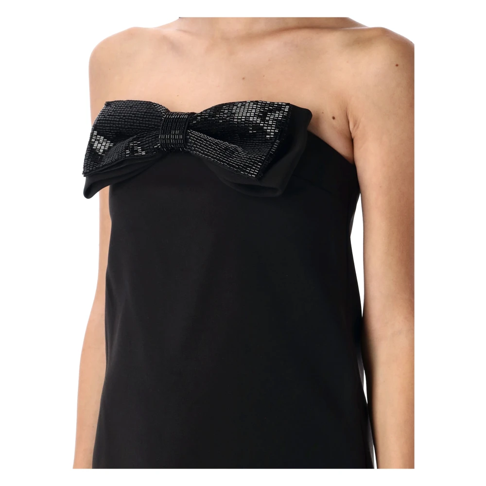 Verrijk je garderobe met de Crepe Bandeau Mini Jurk van Self Portrait. Dit elegante kledingstuk heeft een bandeau halslijn en een prachtige strikdetail, perfect voor chique verfijning bij elk evenement. Belangrijkste kenmerken: Zwart | Crepe | Bandeau halslijn | Strikdetail | Afmetingen en pasvorm: Aansluitende stijl, neem een maat groter als je tussen twee maten in zit | Minimale stretch | Samenstelling en onderhoud: 100% Polyester