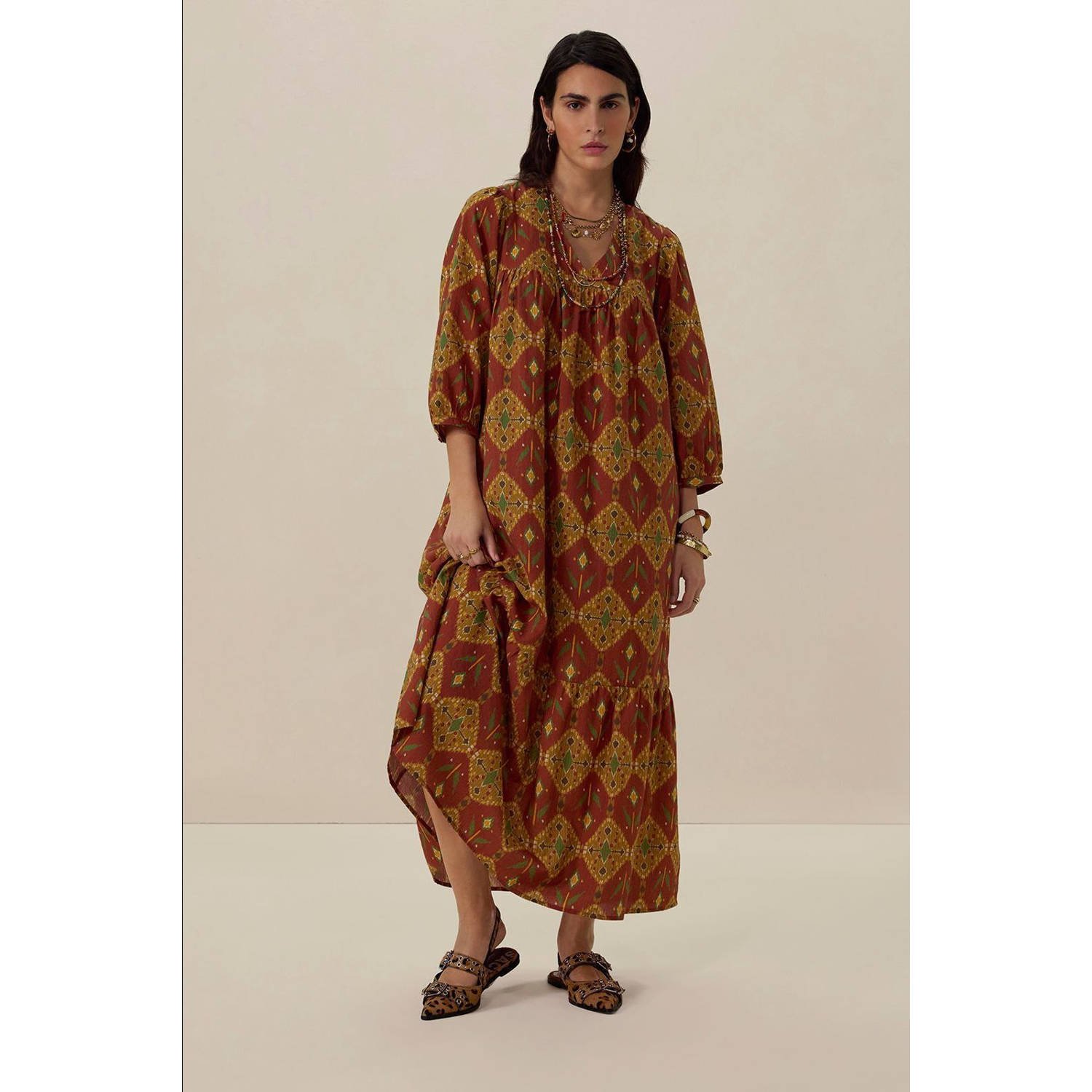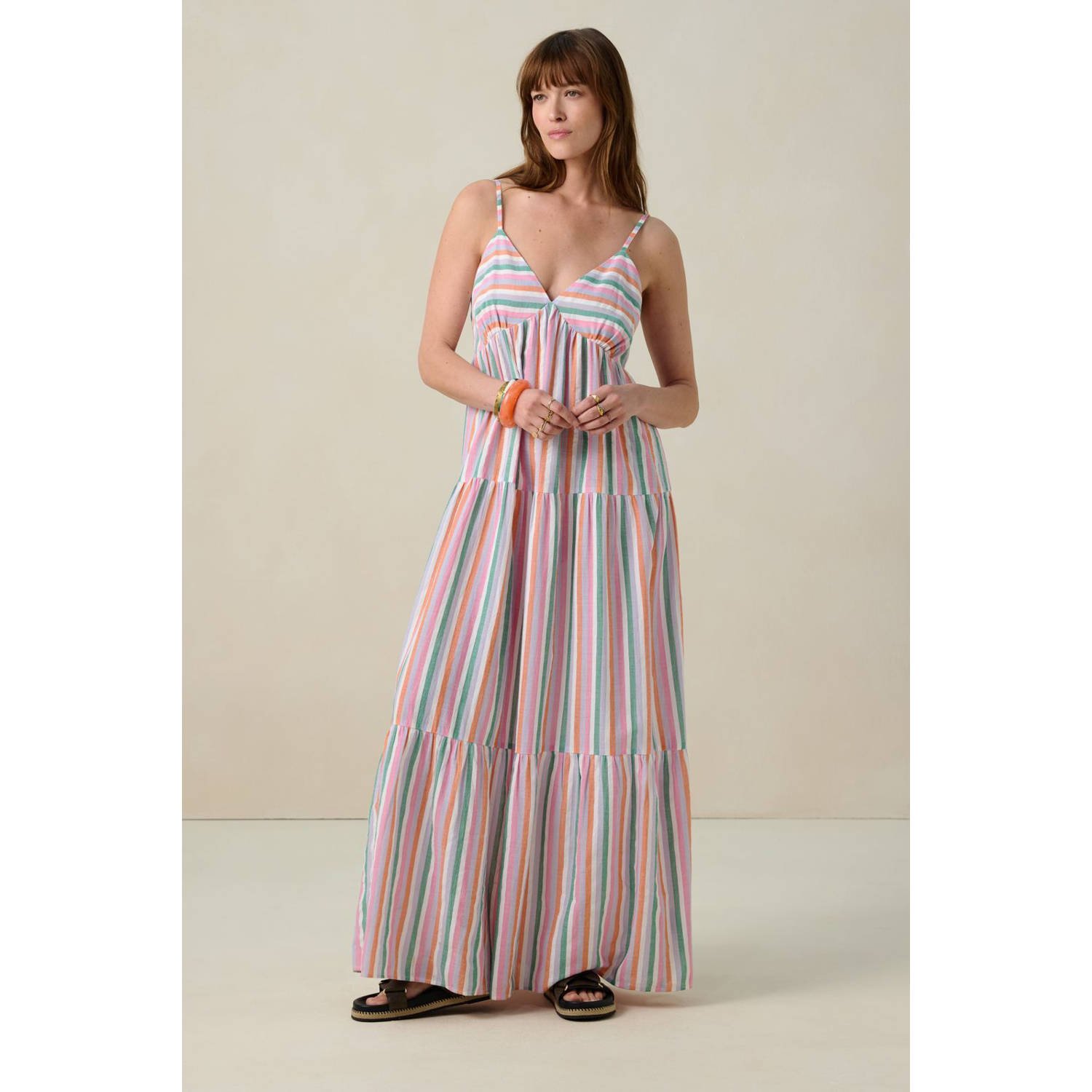 Multicolour maxi-jurk met streeppatroon van Sissy-Boy. De jurk heeft een V-halslijn, korte kapmouwen en sluit aan de voorzijde met een striksluiting. Het model is gelaagd en uitlopend. De strepen bestaan uit de kleuren groen, paars, bruin, wit, donkergroen, grijs en mintgroen. Het model heeft een lengte van 1, 77 m en draagt maat S. Materiaal: 100% katoen.