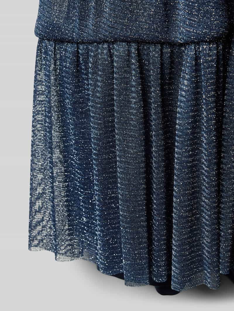 Deze jurk van s.Oliver is donkerblauw en gemaakt van polyamide. De jurk heeft lange mouwen en een stijlvolle V-hals. Deze korte glitterjurk zonder sluiting is perfect voor meisjes met een smaakvolle uitstraling.