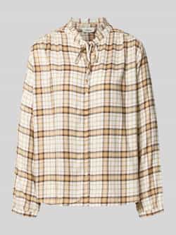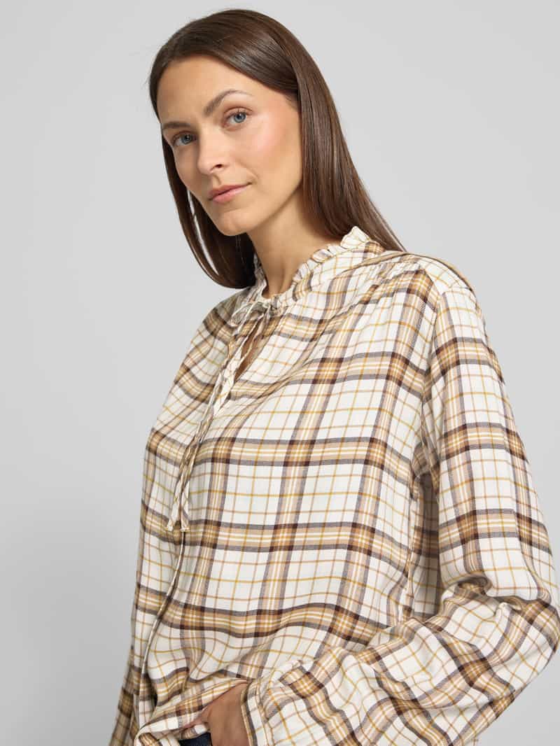 Overhemdblouse voor dames van s.Oliver RED LABEL. Look: All-over motief. Pasvorm: Regular fit . Motief: geruit. Applicatie: Rugpas met plooien, volant. Sluiting: Strik, enkele knoopsluiting. Mouwvorm: lange mouwen. Mouwboord: smalle manchet. Rompzoom: licht afgerond. Materiaal: Mix van modal en viscose