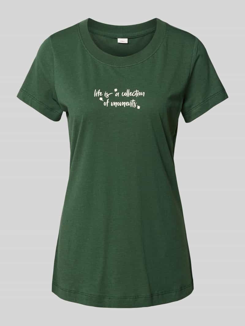 T-shirt voor dames van s.Oliver RED LABEL. Katoen- en viscosemix. Recht model. Melangelook. U-hals. Statementprint. Ruglengte bij maat 36-38: 61 cm