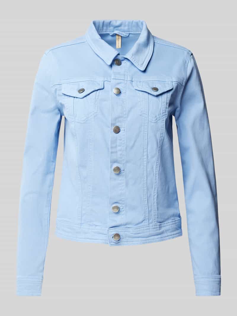 Jeansjack van Soyaconcept voor dames. Mix van katoen en elastaan. Recht model. Model 'Erna'. Platte kraag. Doorknoopsluiting. Borstzakken met klep. Ruglengte bij maat S: 49 cm. Schouderbreedte bij maat S: 38 cm. Borstomvang bij maat S: 42 cm. Mouwlengte bij maat S: 60 cm