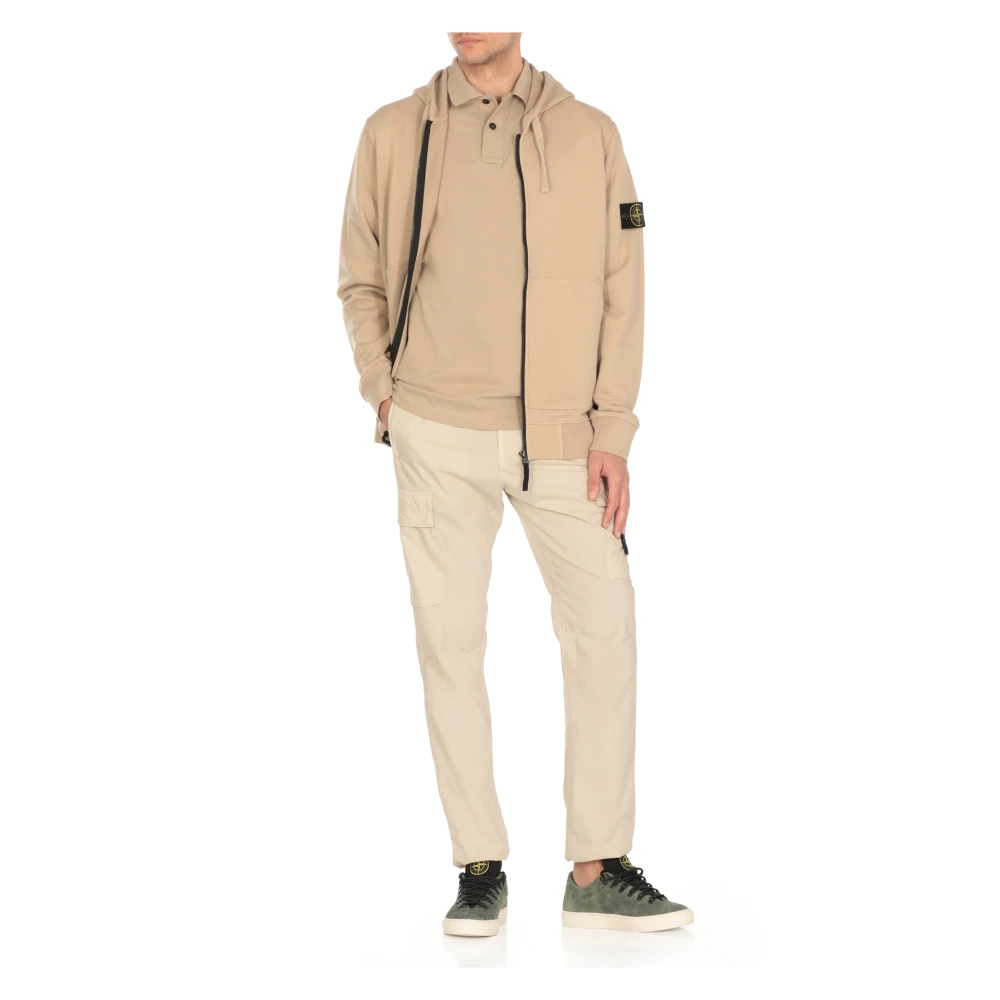 Upgrade je garderobe met deze beige Stone Island katoenen sweatshirt voor mannen. Voorzien van een capuchon met trekkoorden, lange mouwen, ritssluiting aan de voorkant, twee voorzakken, en een contrasterende kleur iconische verwijderbare logo-patch op de linkermouw. Compleet met elastische geribbelde afwerkingen. Model is 190 cm lang en draagt maat L.