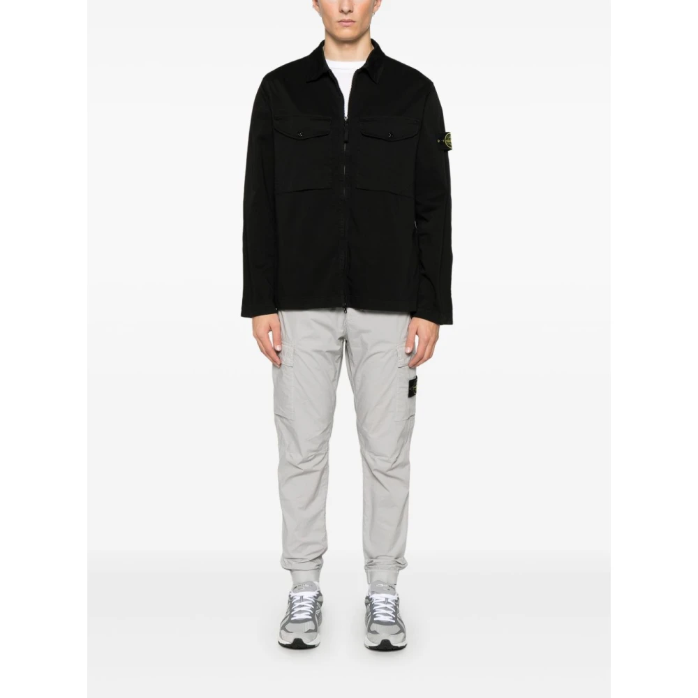 Stone Island zwarte lichte jas voor mannen met tweewegritssluiting aan de voorkant, twee borstklepzakken, lange mouwen en drukknoopmanchetten