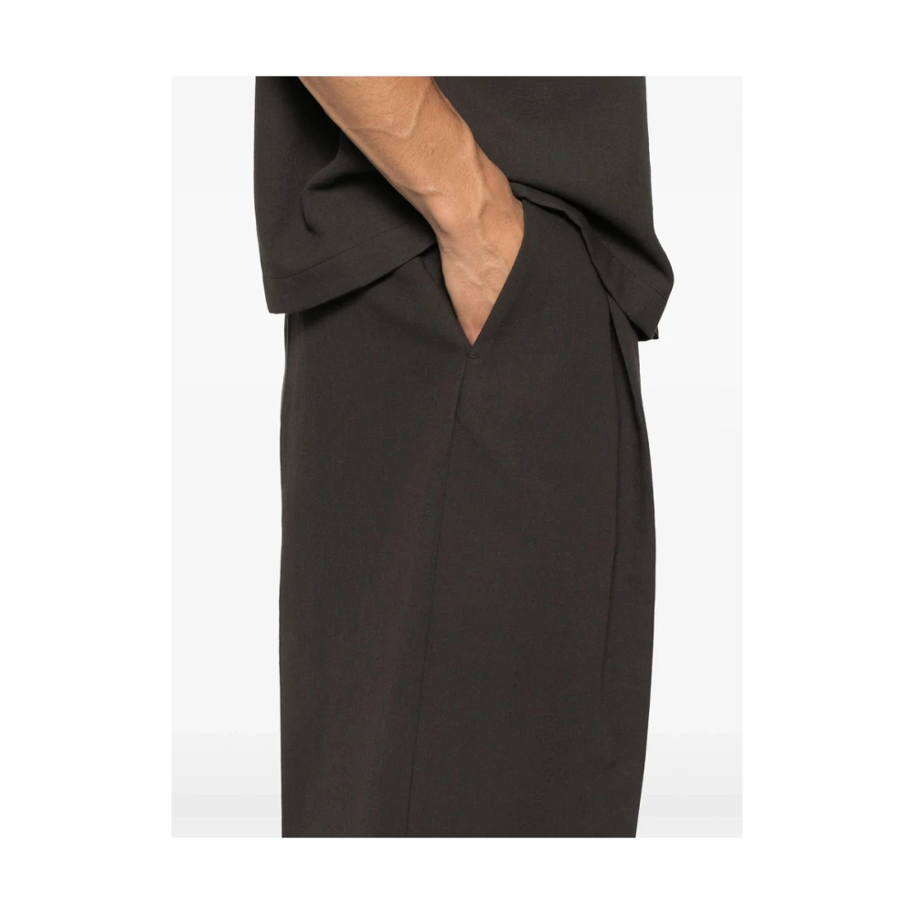 Studio Nicholson lange shorts in cederbruin met knoopsluiting en ritssluiting aan de voorkant, riemlussen, twee diagonale zakken aan de zijkanten en twee achterzakken. Perfect voor de moderne man.