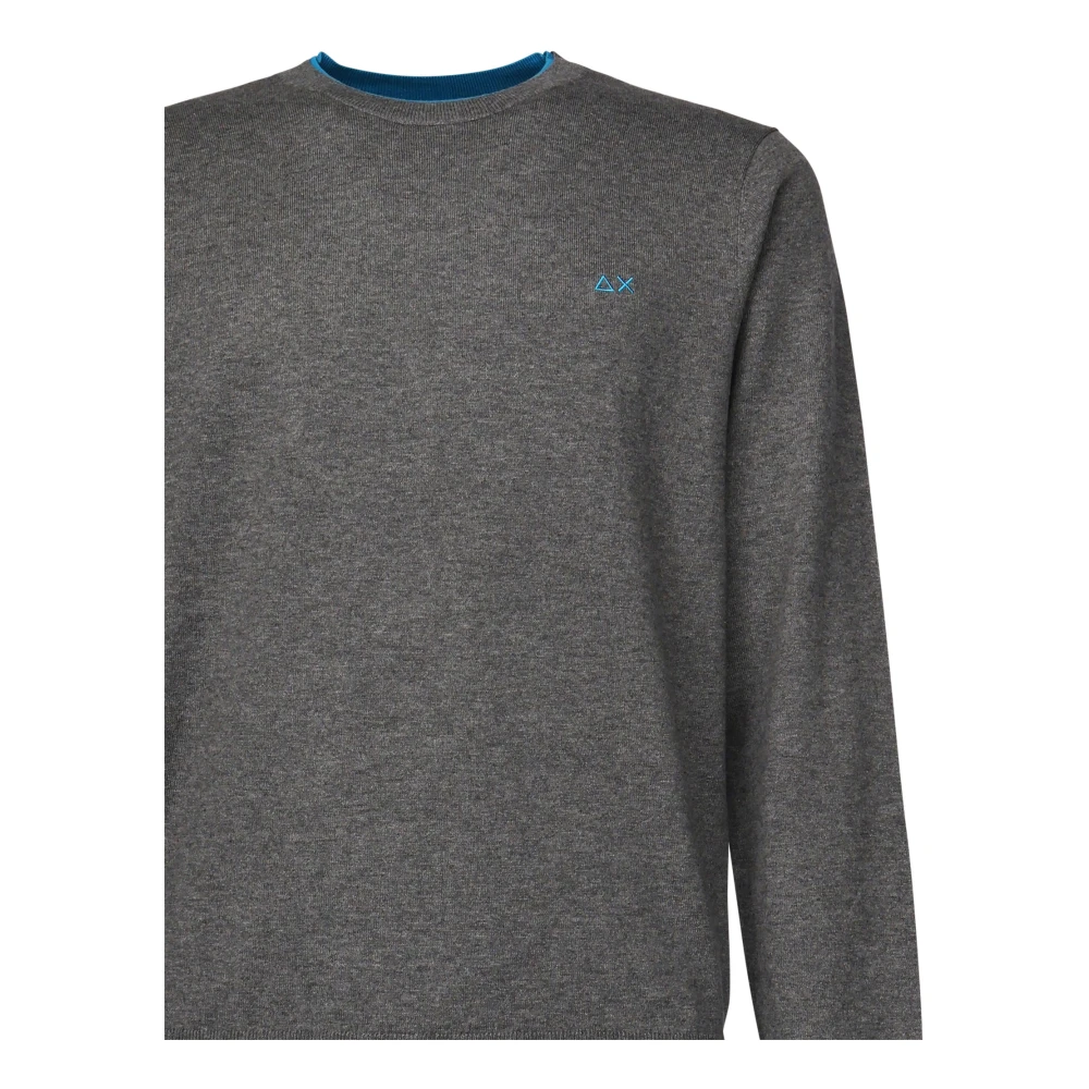 Donkergrijze Sun 68 heren gebreide trui gemaakt van 50% merinowol en 50% katoen, model K44125 met: Gedraaid breisel Geribbelde ronde hals met lichtblauwe zoom Geborduurd lichtblauw logo op de voorkant Lange mouwen met lichtblauwe inzetstukken Geribbelde manchetten en zoom.