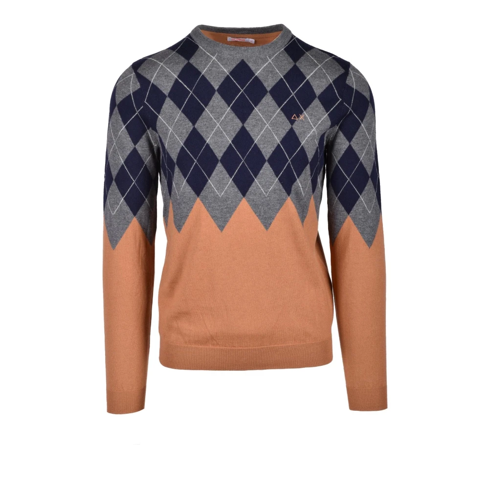 Blijf warm in stijl met deze Sun 68 heren knitwear in roomwit. Gemaakt van een mix van 50% merinowol, 35% viscose, 10% polyamide en 5% kasjmier, dit K44192 model heeft een getextureerd weefpatroon, een lichtbruine geribbelde ronde hals, lange mouwen met grijze achterdetails, een lichtblauwe voorzak en een wit geborduurd logo. Afgewerkt met grijze manchetten en geribbelde zoom.