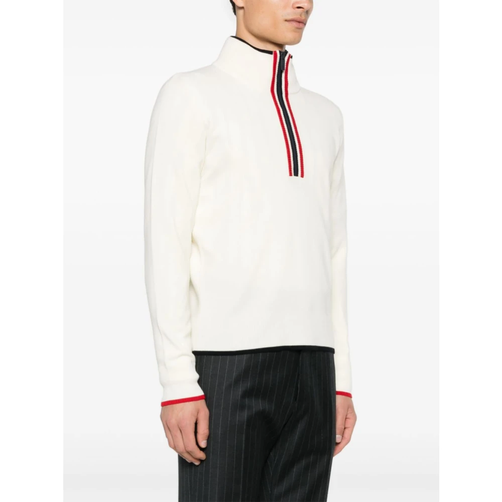Upgrade je stijl met deze off-white Thom Browne coltrui voor heren. Gemaakt van maagdelijke wol, met een fijne breiwerk met RWB-streep grosgrain lint afwerking, geribbelde afwerking, col, halve ritssluiting aan de voorkant, lange mouwen en een rechte zoom.
