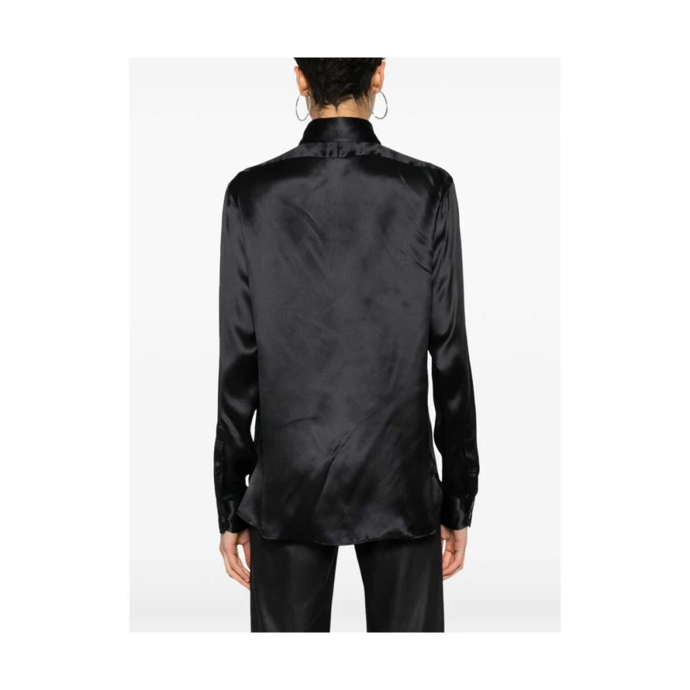Upgrade je garderobe met deze luxueuze zwarte zijden satijnen blouse van Tom Ford. Met een lichtgewicht constructie, puntige platte kraag, pintuck-details, lange mouwen met knoopmanchetten, korte zijsplitten, gebogen zoom en knoopsluiting aan de voorkant.