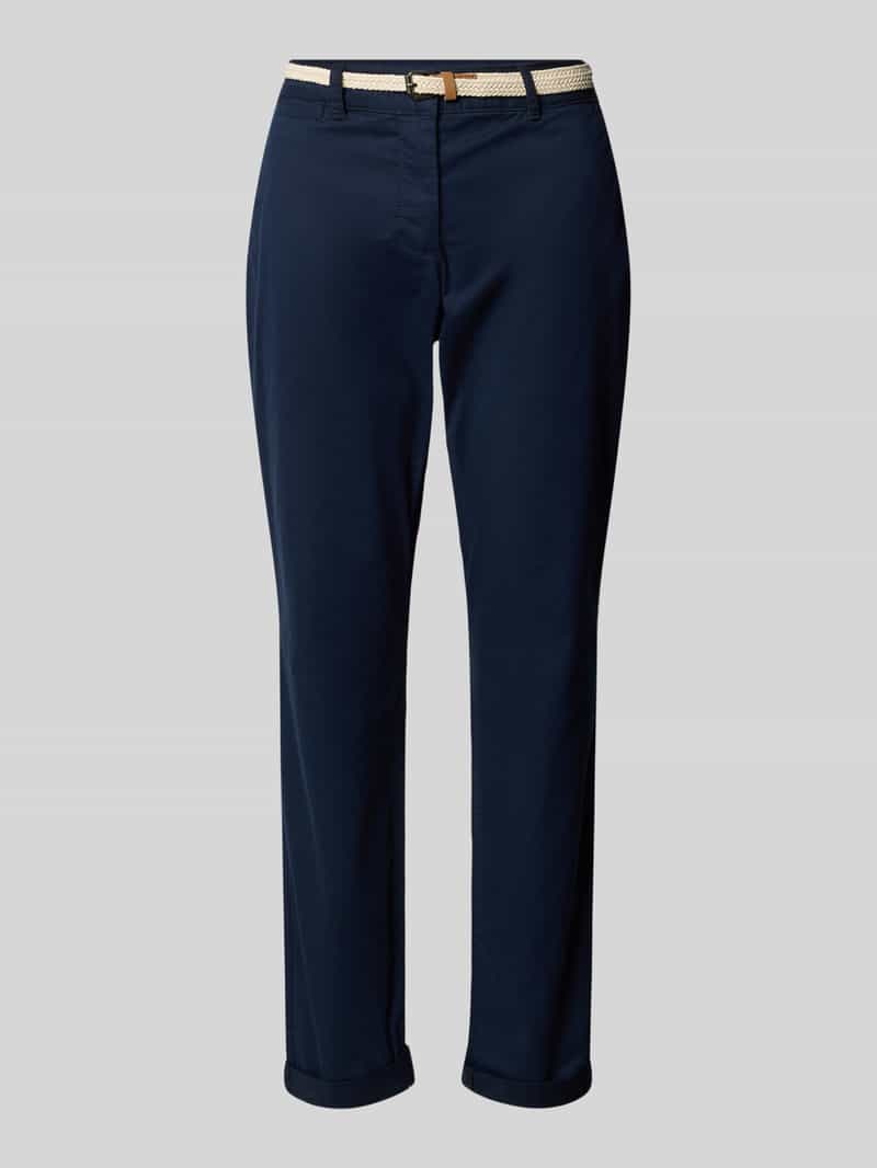 Chino voor dames van Tom Tailor. Look: effen. Pasvorm: Slim fit. Details: gevlochten riem. Sluiting: Knoop en blinde ritssluiting. Zakken: steekzakken opzij. Materiaal: Katoenmix. Bandwijdte bij maat 36/32: 38 cm. Binnenbeenlengte bij maat 36/32: 78 cm