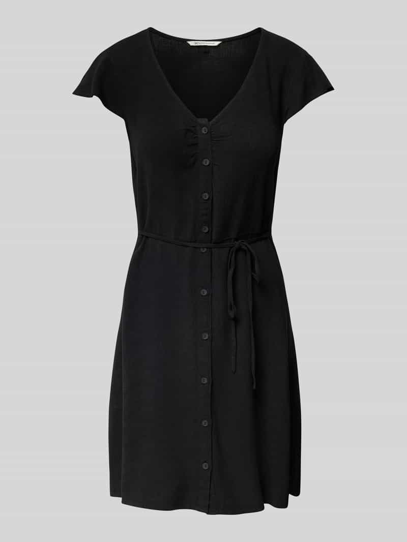 Damesjurk van TOM TAILOR Denim. Mix van viscose en linnen. Getailleerd model. Knielang. Effen design. V-hals. Knoopsluiting. Design met korte mouwen. Ruglengte bij maat S: 99 cm. Borstomvang bij maat S: 44 cm. Mouwlengte bij maat S: 11 cm
