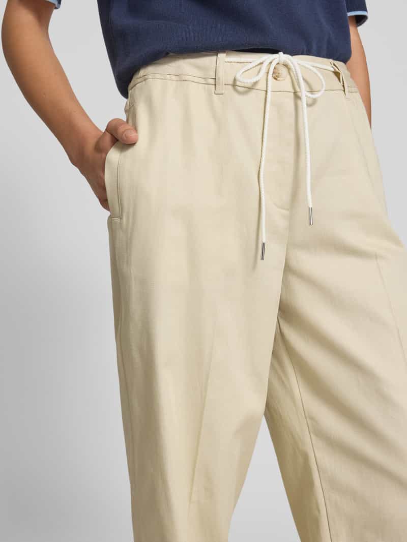 Wijde broek van Tom Tailor voor dames. Model 'Lea'. Look: effen. Pasvorm: Wide fit . Bandhoogte: High rise. Lengte: Lang. Details: Riemlussen, tunnelkoord. Sluiting: Knoop en blinde ritssluiting. Zakken: Achterzakken, steekzakken opzij. Materiaalverwerking: gevlamd garen. Materiaal: puur katoen. Bandwijdte bij maat 36/32: 34 cm. Binnenbeenlengte bij maat 36/32: 77 cm