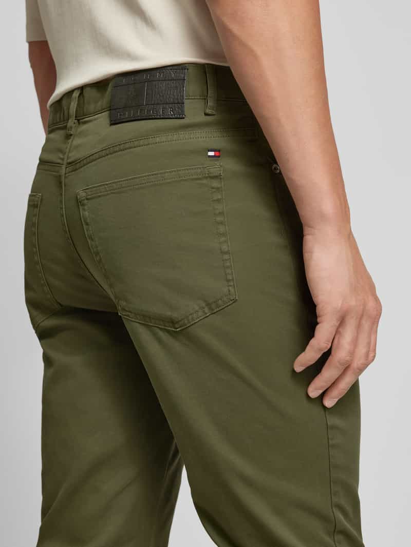 Herenchino van Tommy Hilfiger. Look: effen. Pasvorm/model: Regular fit. Applicatie/versiering: Labelstitching. Sluiting: Knoop- en ritssluiting. Zakken: 5-pocketdesign. Materiaal: Mix van katoen en elastaan. Bandwijdte bij maat 32/32: 44 cm. Binnenbeenlengte bij maat 32/32: 81 cm