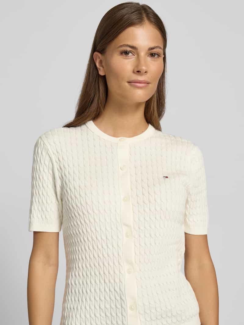 Gebreid damesjack van Tommy Hilfiger. Look: effen/all-over motief. Pasvorm: Regular fit . Sluiting: enkele knoopsluiting. Motief: gestreept/effen, kabelpatroon. Applicatie: Gestikt logo. Hals: ronde hals. Mouwvorm: korte mouwen. Mouwboord: geribd. Rompzoom: geribd. Materiaalverwerking: Knitwear. Materiaal: puur katoen. Ruglengte bij maat S: 56, 5 cm. Borstomvang bij maat S: 42, 5 cm