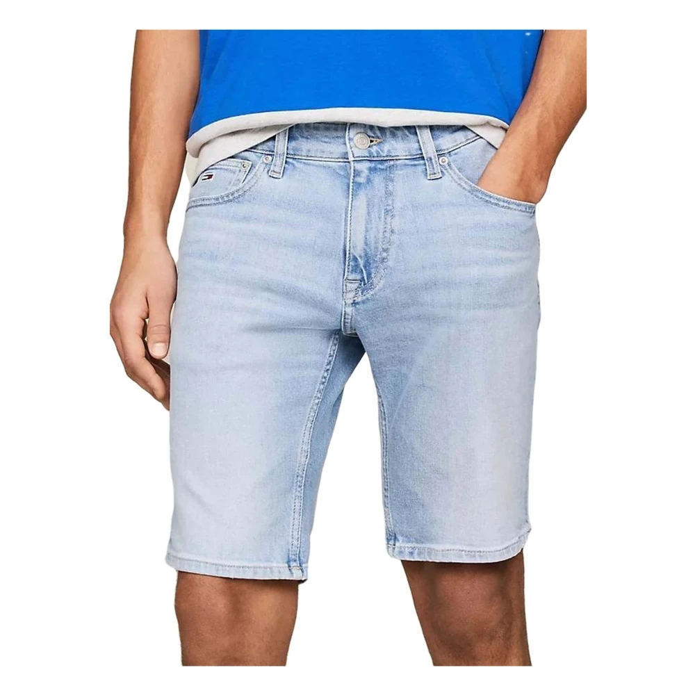 Tijdloze effen blauwe heren denim shorts met een versleten effect. Merk: Tommy Hilfiger Jeans. Geslacht: Mannen. Type: Shorts. Seizoen: Lente/Zomer. Kleur: Blauw. Patroon: Effen. Sluiting: Rits en knoop. Zakken: Voorzakken en achterzakken