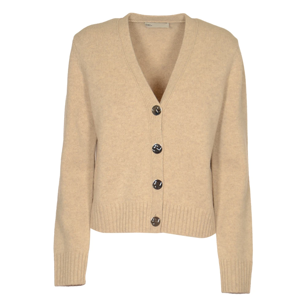 Blijf stijlvol en gezellig met deze beige Tory Burch cardigan met contrasterende zwarte afwerking, goudkleurige knopen, een ronde halslijn, relif merkmonogram over de hele voorkant en zakken. Gemaakt van 65% katoen, 29% polyamide en 6% elastaan.