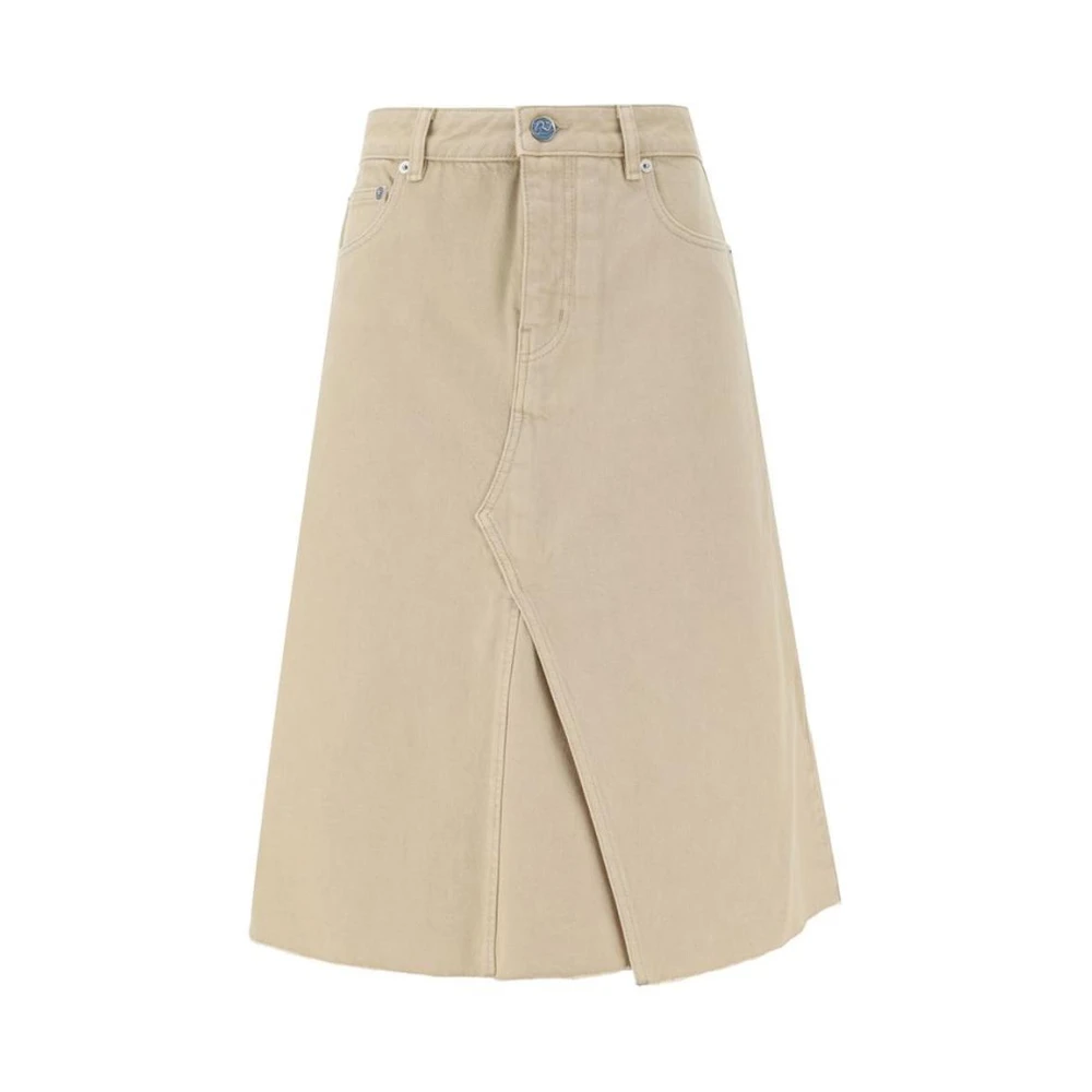 Upgrade je denim look met deze klassieke Tory Burch denim rok. Gemaakt van 100% katoen, deze beige rok heeft een tailleband met riemlussen, rits- en knoopsluiting en het klassieke vijfzakkenpatroon. Gemaakt in China. Model draagt maat 6. Modelafmetingen: Lengte - 175 cm, Borst - 86, 5 cm, Taille - 65 cm, Heupen - 92 cm, Schouder - 40 cm.