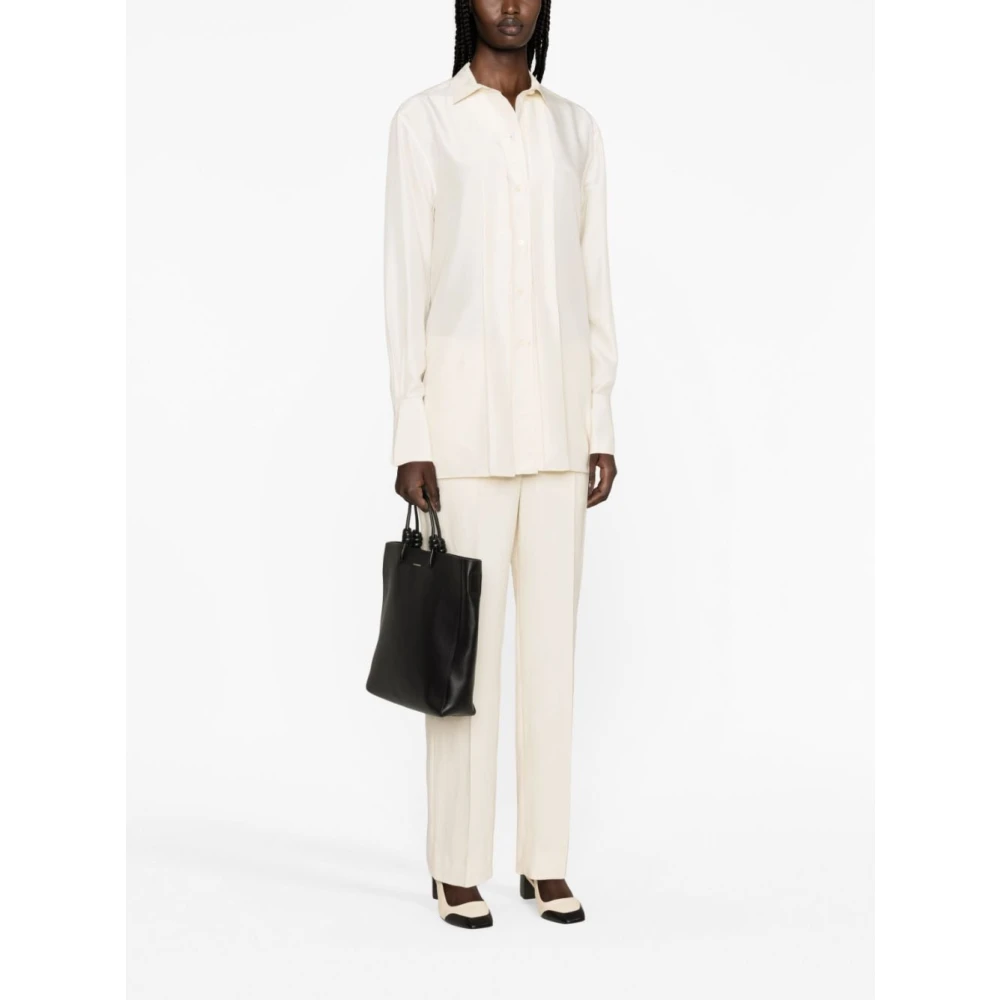 Upgrade je garderobe met de ivoorkleurige zijden habutai blouse van Totme. Dit klassieke stuk heeft een voorplooiende plastron, klassieke kraag, knoopsluiting, lange mouwen met knoopmanchetten en een gebogen zoom. Ontworpen voor een losse pasvorm, past het true to size. Model draagt maat 34.