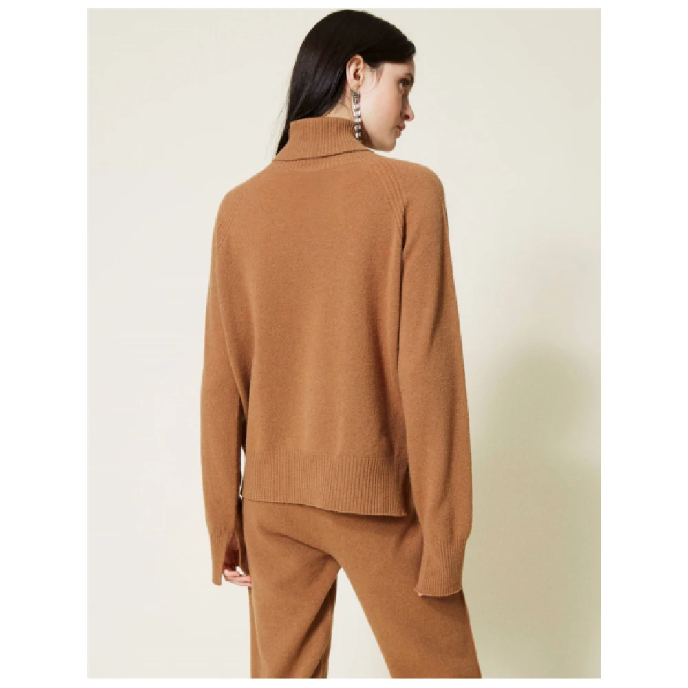 Blijf gezellig en stijlvol met deze bruine Twinset coltrui. Gemaakt van een mix van wol en kasjmier, heeft deze lang gesneden trui zijsplitten en brede ribboorden. Het Twinset-label is geborduurd op de linkerzoom. Perfect voor een snelle en comfortabele dagelijkse outfit, combineer het met jeans of wees creatief voor een meer gepolijste look. Stofdetails: 58% wol, 42% kasjmier.