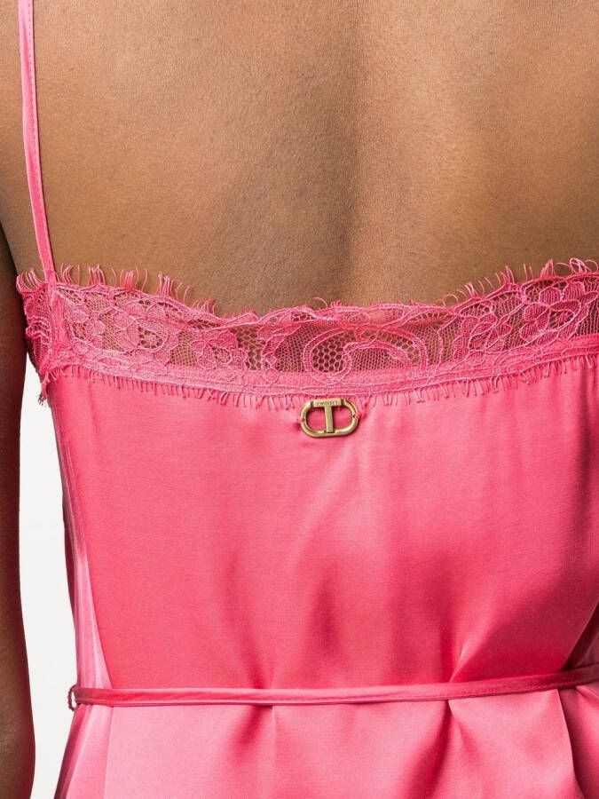 Kauwgomroze, bloemenkant detail, goudkleurig logo, sweetheart-hals, spaghettibandjes, gestrikte taille, mouwloos, mouwloos, rechte zoom en driekwart lengte.