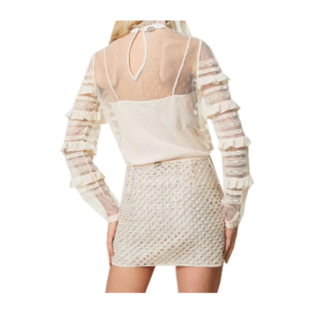 Upgrade je garderobe met deze Twinset-blouse in tule plumetis met georgette ruches en kanten randen. Mouwloos en geleverd met een bijpassende top. Gemaakt van viscose
