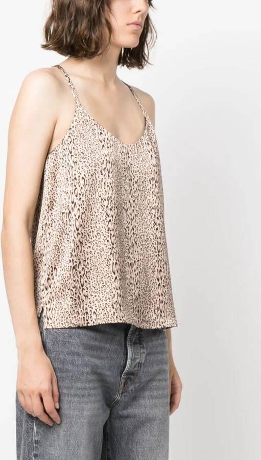 Cederbruin, lichtbruin, gitzwart, all-over luipaardprint, satijnen afwerking, ronde hals, spaghettibandjes, mouwloos, racerback en rechte zoom.
