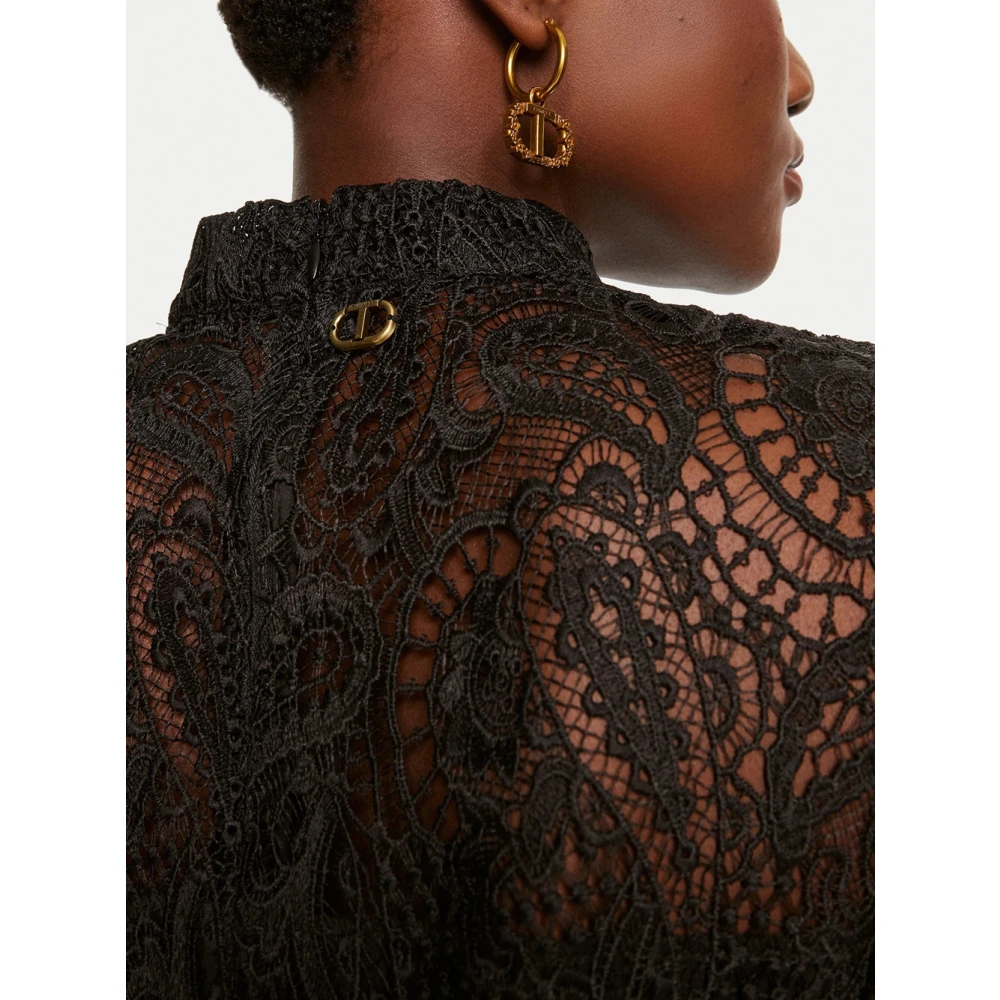 Upgrade je feestlook met deze zwarte macram kanten cropped blouse van Twinset. Met een mandarijnkraag, lange handschoenmouwen en een asymmetrische zoom is deze blouse perfect voor speciale gelegenheden. Gemaakt van 100% polyester met een crepe de Chine voering, biedt het een aansluitende pasvorm en een vleugje elegantie. Alleen handwas aanbevolen
