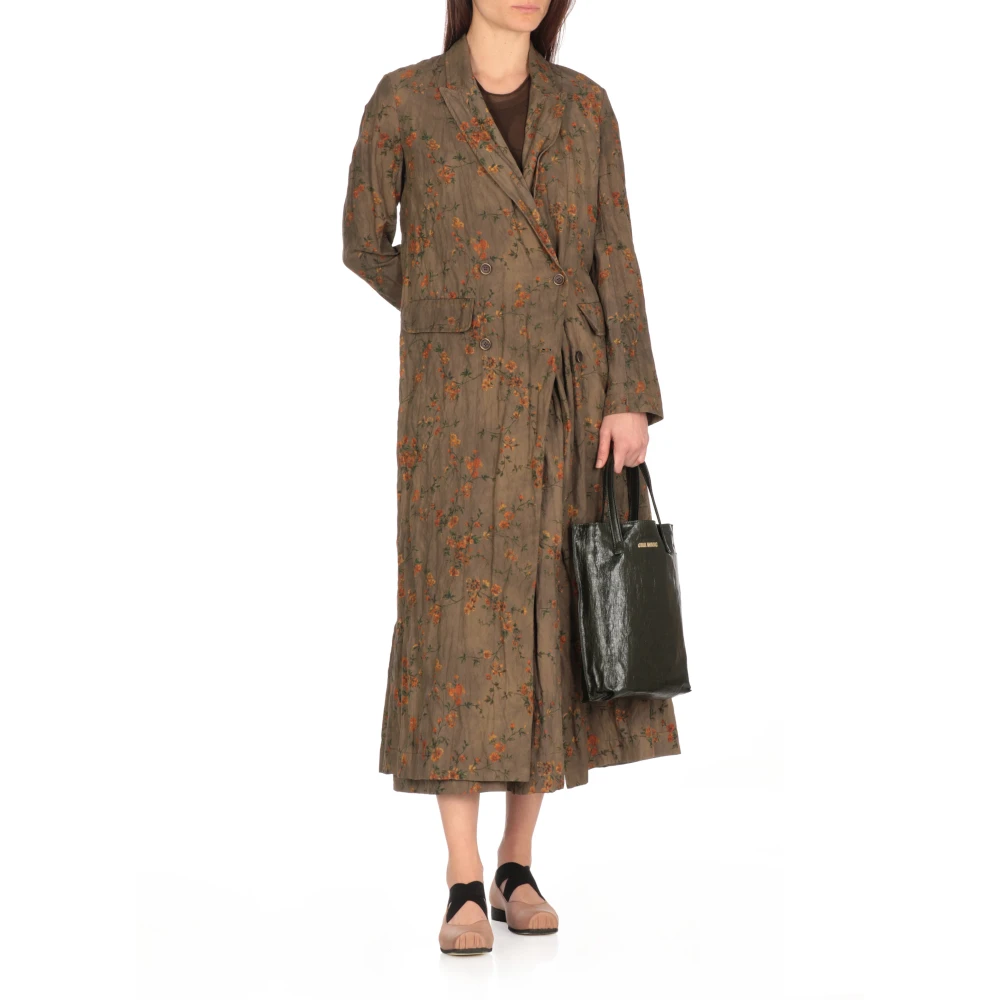 Upgrade je stijl met deze legergroene Uma Wang katoenen double-breasted jas voor vrouwen. Voorzien van een peak lapel kraag, lange mouwen met knoopdetails, twee voorflapzakken en een prachtig contrasterend bloemenpatroon over de hele jas. Model is 179 cm lang en draagt maat S.