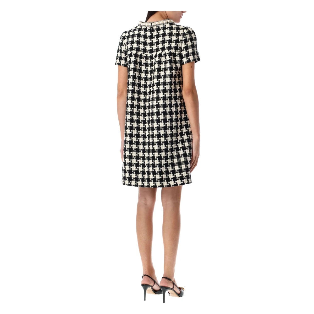 Verrijk je stijl met deze geborduurde Damier lichte tweed korte jurk van Valentino Garavani. Met een ronde hals, korte mouwen, achterrits en haak-en-oogsluiting, en geborduurde stenen en micro-elementen op de halslijn en zakken. Gemaakt van een luxueuze mix van 40% acryl, 37% zuivere wol, 19% katoen en 4% polyamide. Habotai-voering voor extra comfort. Model is 1, 70 m en draagt maat 40.