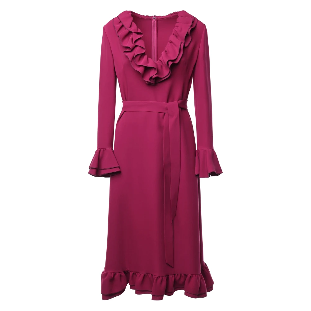 Jurk met riem van Valentino voorzien van split bij het decollet, klokkende mouwen, flared en rits aan de achterkant.