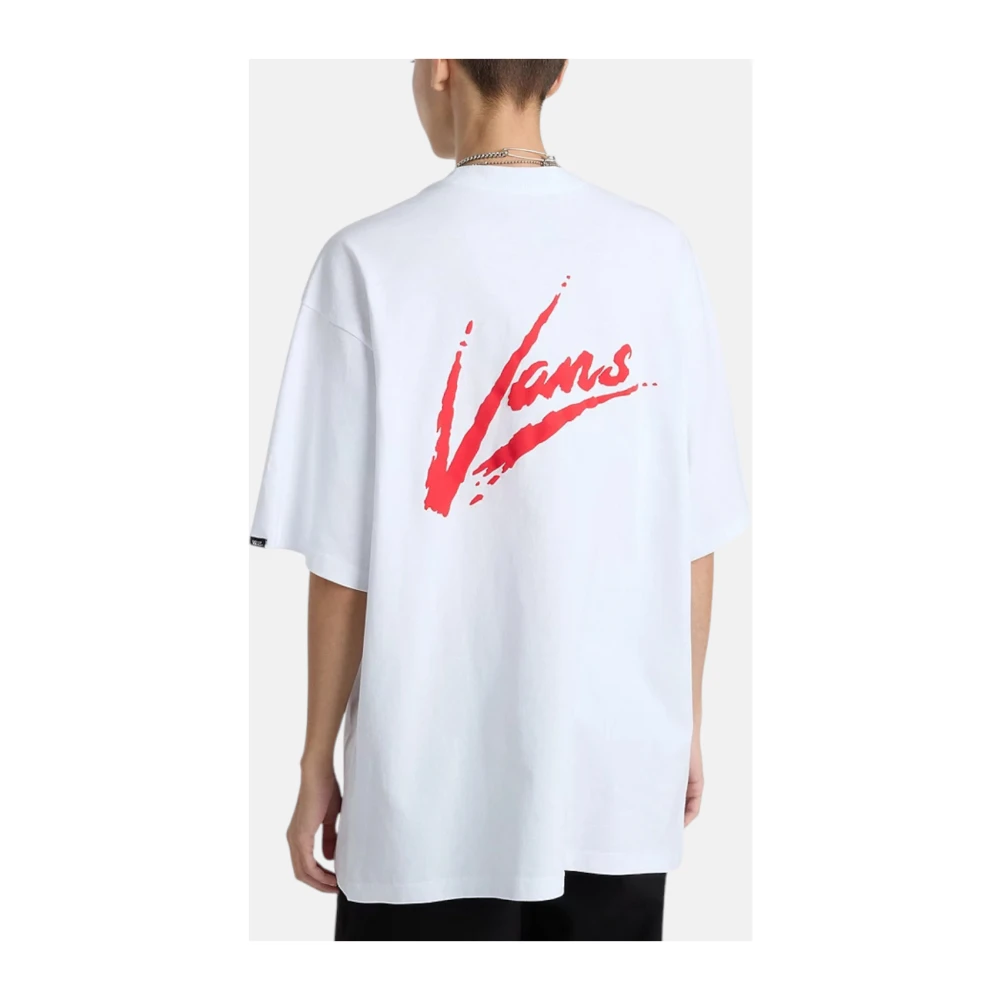 Blijf stijlvol en comfortabel in dit loszittende Vans T-shirt voor vrouwen. Voorzien van geribbelde ronde hals, bedrukte logo's aan de voor- en achterkant, en gemaakt van 100% katoen. Model is 1, 89 m lang en draagt maat L.