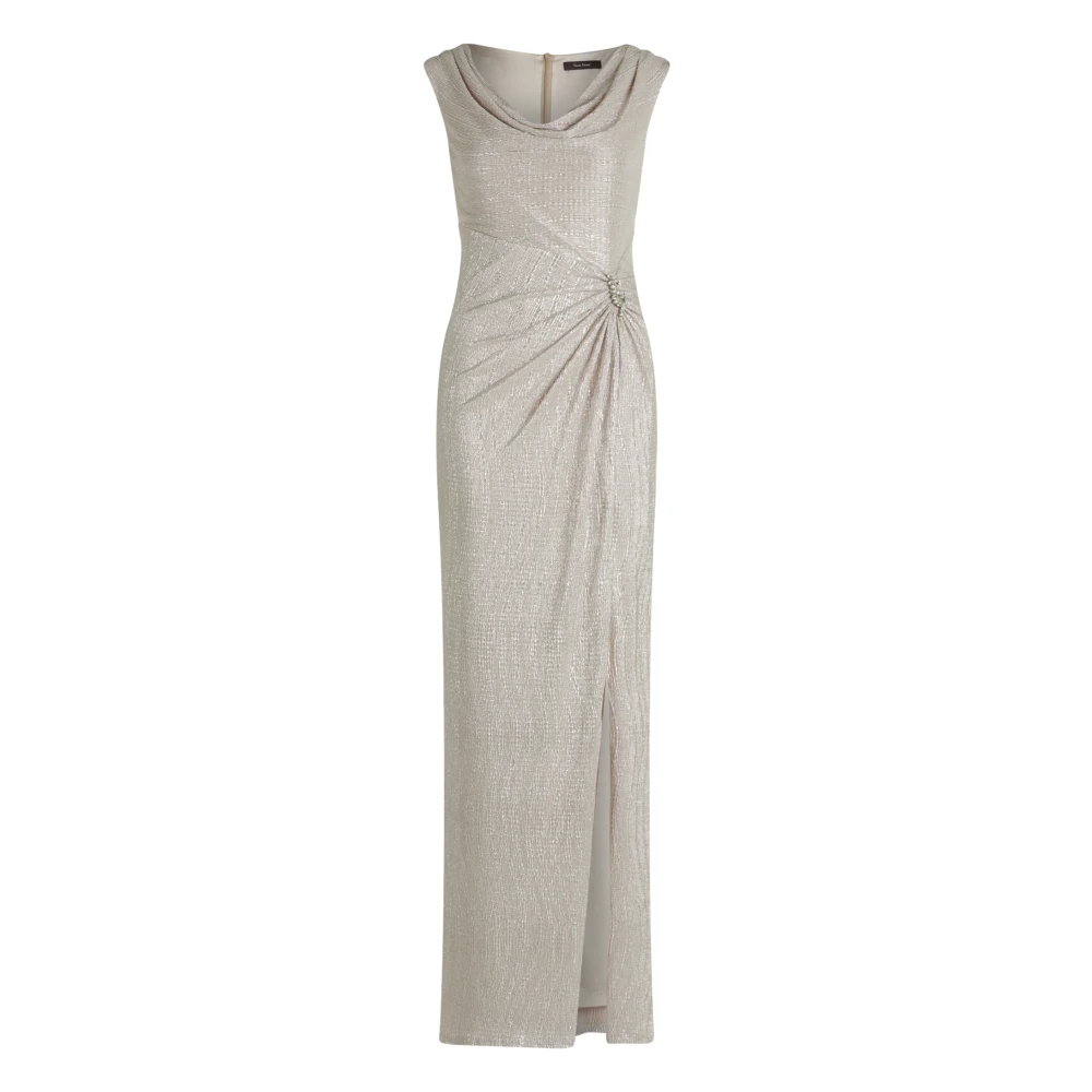 Avondjurk van V.M. van Vera Mont. Nauwsluitend model. Maxi-jurk. Spaghettibandjes. Cascadehals. Effectgaren. Borstomvang bij maat 36: 32 cm