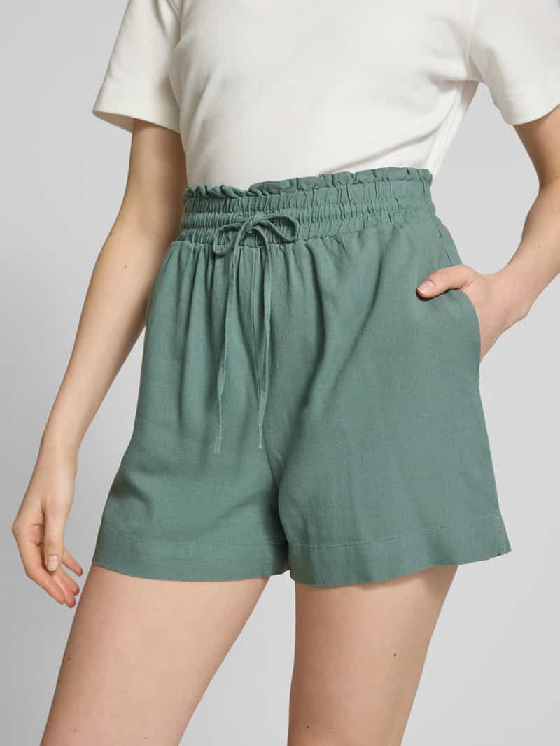 Korte damesbroek van Vero Moda. Model 'MYMILO'. Look: effen/all-over motief. Pasvorm: Loose fit. Sluiting: Tunnelkoord. Band: elastisch. Zakken: steekzakken opzij. Materiaal: Mix van viscose en linnen. Bandwijdte bij maat S: 35 cm