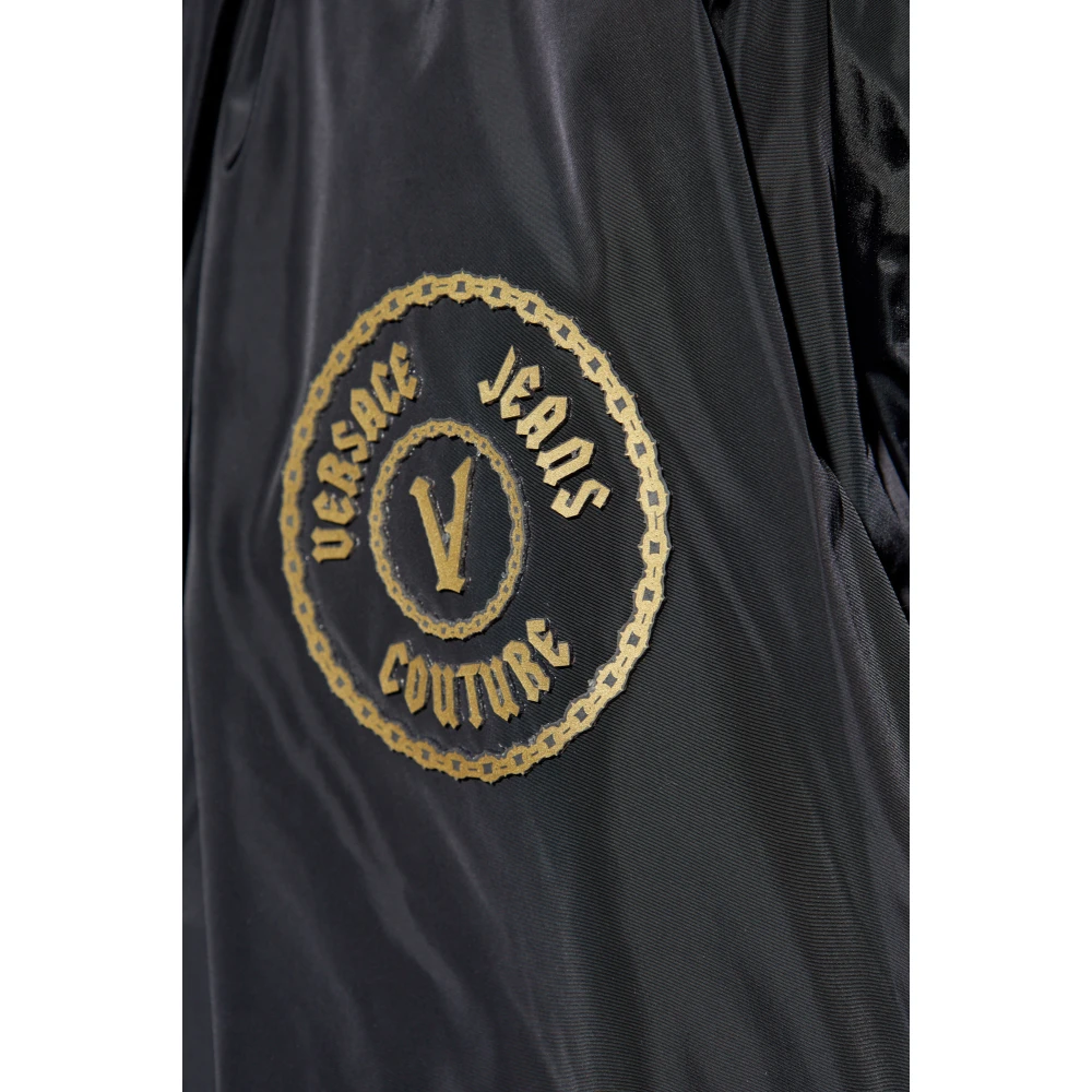 Introductie van de exclusieve Reversible JAS van Versace Jeans Couture, de perfecte mix van luxe en functionaliteit. Dit uitzonderlijke kledingstuk maakt indruk met zowel elegant design als praktisch nut. Onderzijde Ontwerp: Dominante zwarte kleur, rijkelijk versierd met gouden kettingen en
