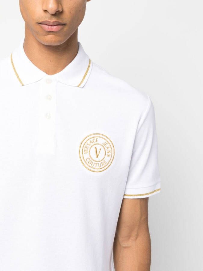 Wit, oranje, katoen, geborduurd logo, polokraag, knoop aan de voorkant, korte mouwen en rechte zoom.